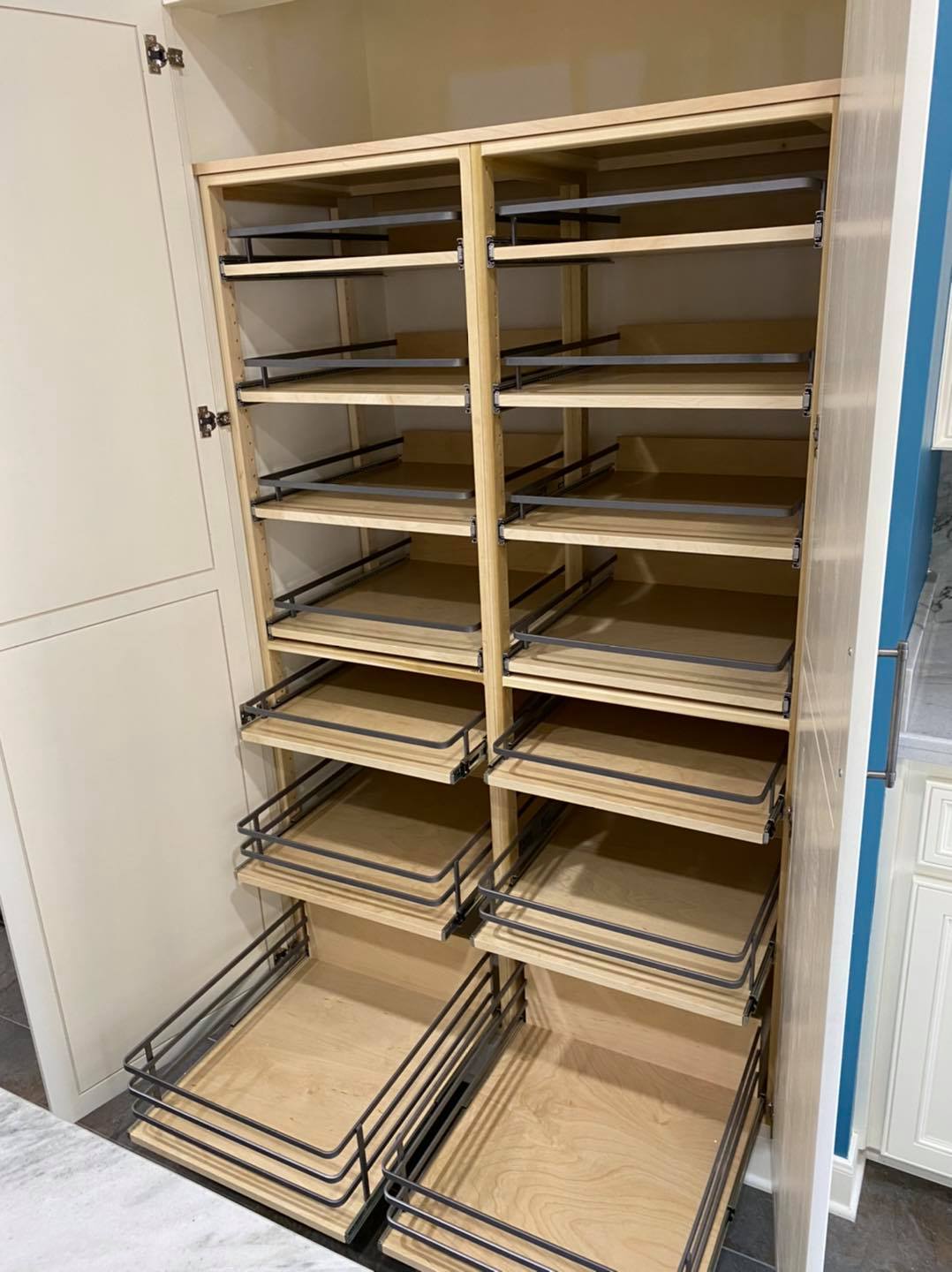 Baskets, drawers, and shelves are all available to mix and match in your new custom pantry. Email us today to get your order started!