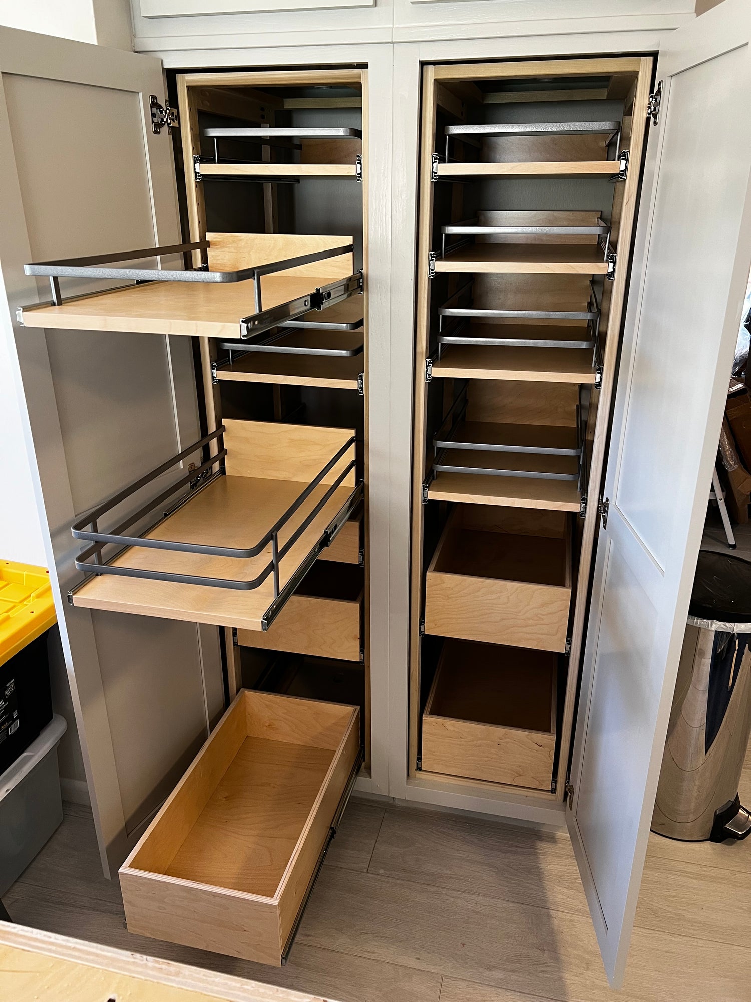 We build the drawers and made-to-fit slide out shelves for existing cabinets and ship them right to your door, fully assembled, ready to install! Upgrading your kitchen and adding pull out storage space has never been so easy!